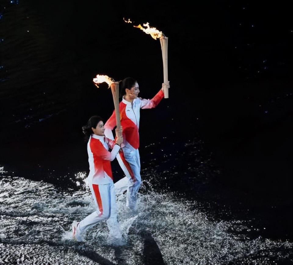 郭晶晶踏在浅水里,双手高举火炬,火光映着她指节上常年训练留下的薄茧。