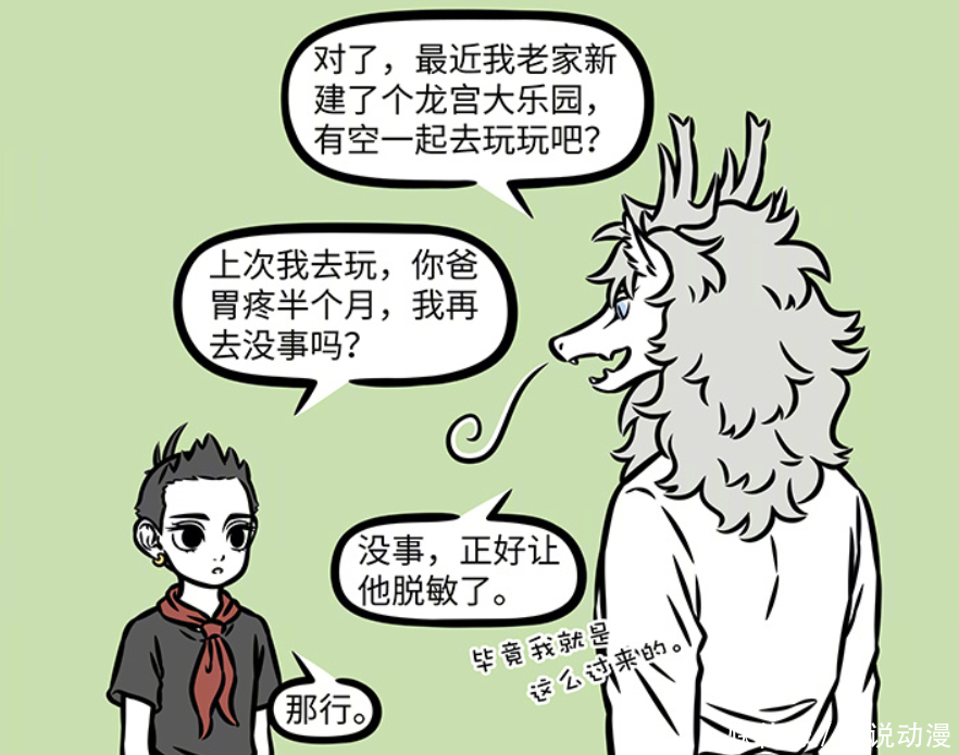 敖烈告诉哪吒,老家最近新建龙宫大乐园,还让哪吒一起去玩玩。哪吒表示,上一次去玩,敖烈的爸爸敖闰就因此胃疼了半个月,如果他再去的话,不会有问题吗?敖烈告诉哪吒,刚好给爸爸脱敏。敖烈以前也是这么过来的,所以没什么问题。